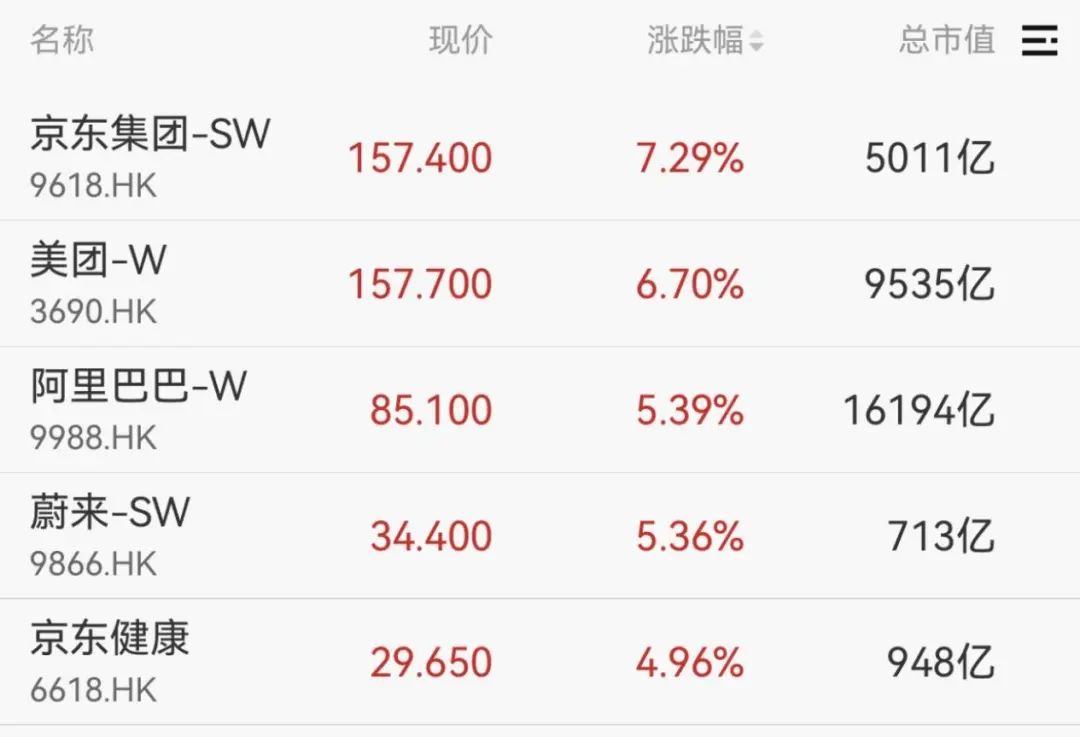 港股方面,三大指数均涨超2%,京东集团涨超7%,美团、阿里巴巴、蔚来均涨超5%。