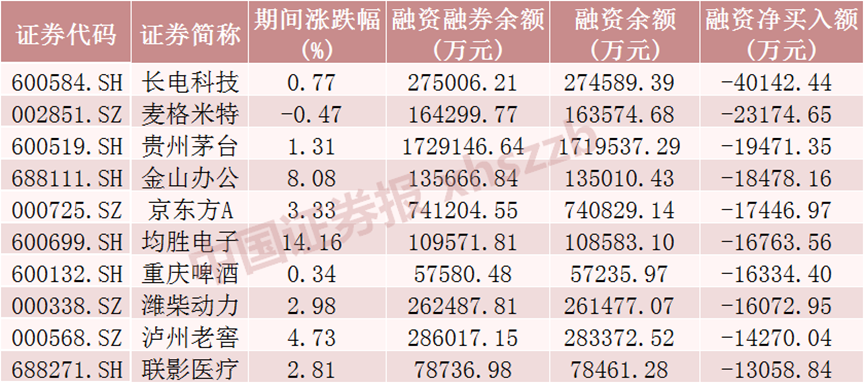 上周融资客减仓居前的十只股票分别为长电科技、麦格米特、贵州茅台、金山办公、京东方A、均胜电子、重庆啤酒、潍柴动力、泸州老窖、联影医疗,分别净卖出4.01亿元、2.32亿元、1.95亿元、1.85亿元、1.74亿元、1.68亿元、1.63亿元、1.61亿元、1.43亿元、1.31亿元。这十只股票中除麦格米特上周下跌0.47%外,其他股票均上涨,涨幅最大的均胜电子涨逾14%。