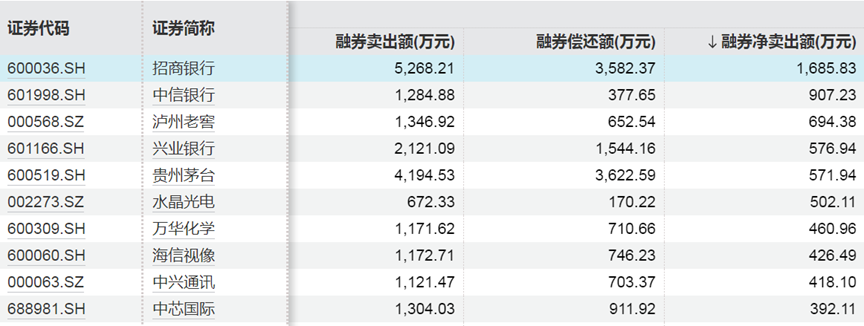 上周招商银行、中信银行、泸州老窖融券净卖出额居前,分别为1685.83万元、907.23万元、694.38万元。