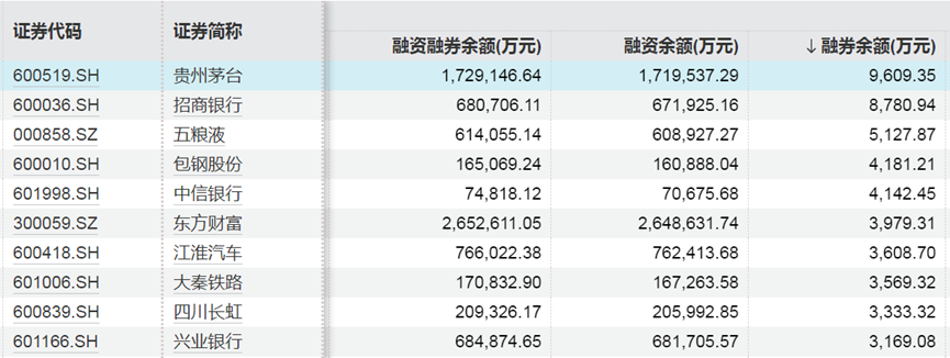 截至1月17日,A股市场上,贵州茅台、招商银行、五粮液融券余额居前,分别为0.96亿元、0.88亿元、0.51亿元。