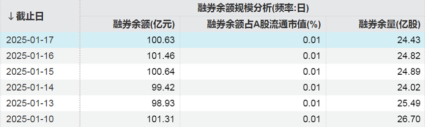 截至1月17日,A股市场融券余额为100.63亿元,环比减少0.68亿元,融券余量为24.43亿股。