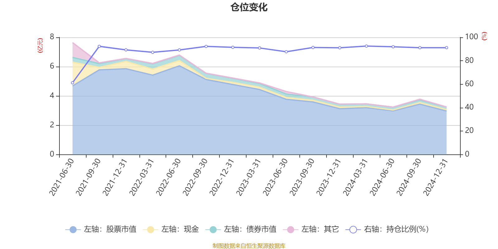 据定期报告数据统计,近三年平均股票仓位为90.68%,同类平均为84.92%。2024年一季度末基金达到92.55%的最高仓位,2021年上半年末最低,为61.24%。