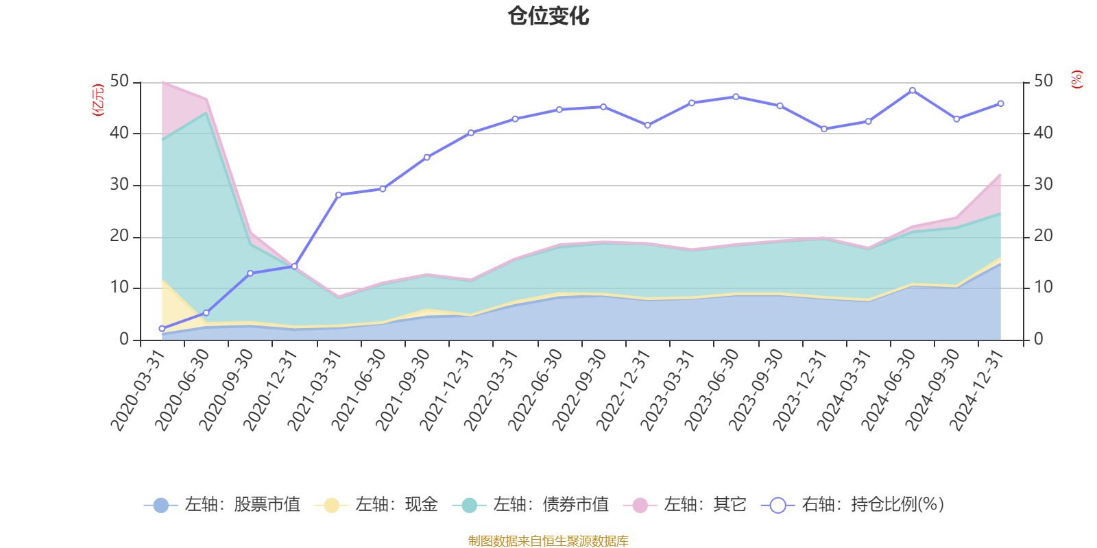 据定期报告数据统计,近三年平均股票仓位为44.46%,同类平均为18.78%。2024年上半年末基金达到48.43%的最高仓位,2020年一季度末最低,为2.24%。