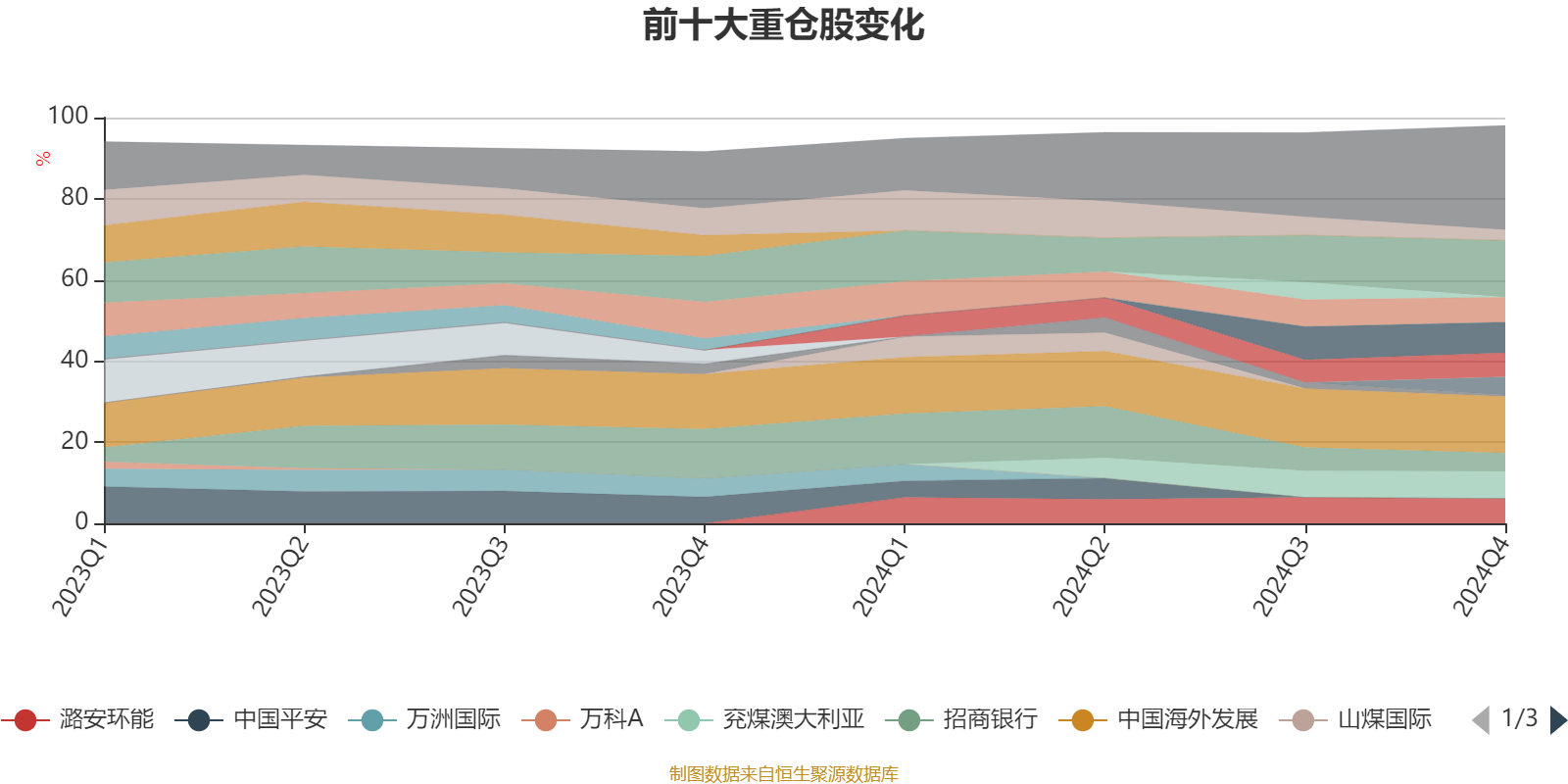 该基金持股集中度较高,近2年前十大重仓股集中度长期超过60%。截至2024年四季度末,基金十大重仓股分别是中国海洋石油、中国海外发展、中国建材、兖煤澳大利亚、美的集团、潞安环能、山西焦煤、招商银行、晋控煤业、海螺水泥、中国海油。