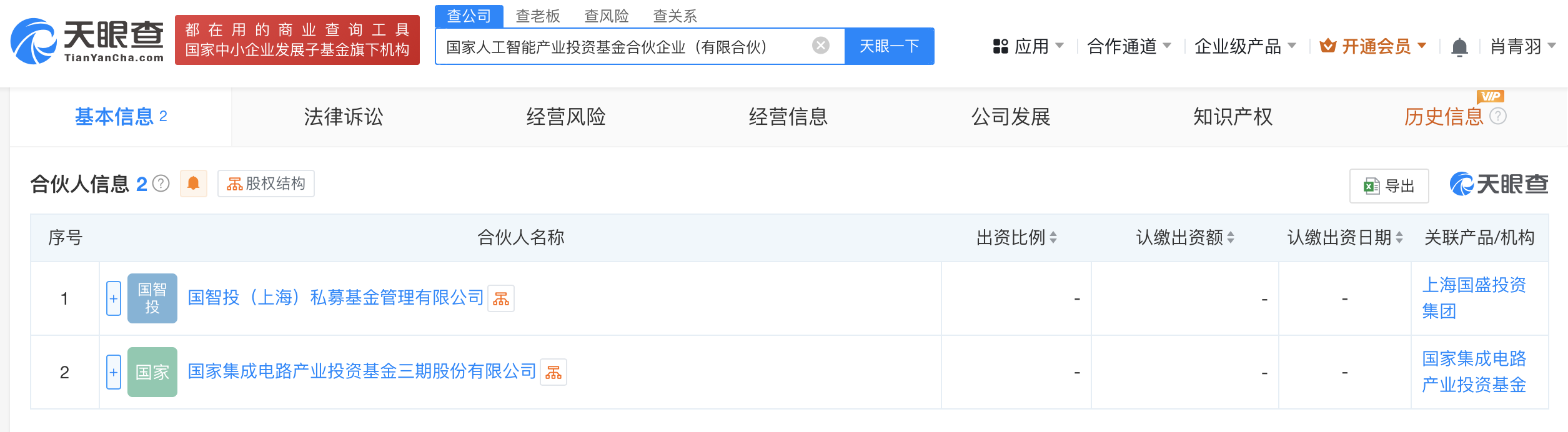 每经AI快讯,天眼查App显示,近日,国家人工智能产业投资基金合伙企业(有限合伙)成立,执行事务合伙人为国智投(上海)私募基金管理有限公司,出资额600.6亿人民币,经营范围包括以私募基金从事股权投资、投资管理、资产管理等活动。合伙人信息显示,该基金由国智投(上海)私募基金管理有限公司、国家集成电路产业投资基金三期股份有限公司共同出资。