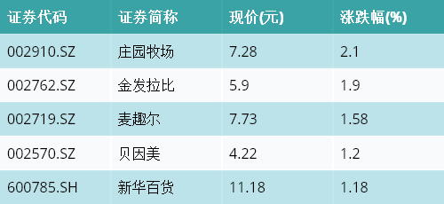 截至收盘,乳业主题涨跌幅最高的五只股票为:庄园牧场(002910.SZ)、金发拉比(002762.SZ)、麦趣尔(002719.SZ)、贝因美(002570.SZ)与新华百货(600785.SH)。详情见下表: