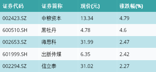 截至收盘,参股保险主题涨跌幅最高的五只股票为:中粮资本(002423.SZ)、黑牡丹(600510.SH)、海思科(002653.SZ)、出版传媒(601999.SH)与信立泰(002294.SZ)。详情见下表: