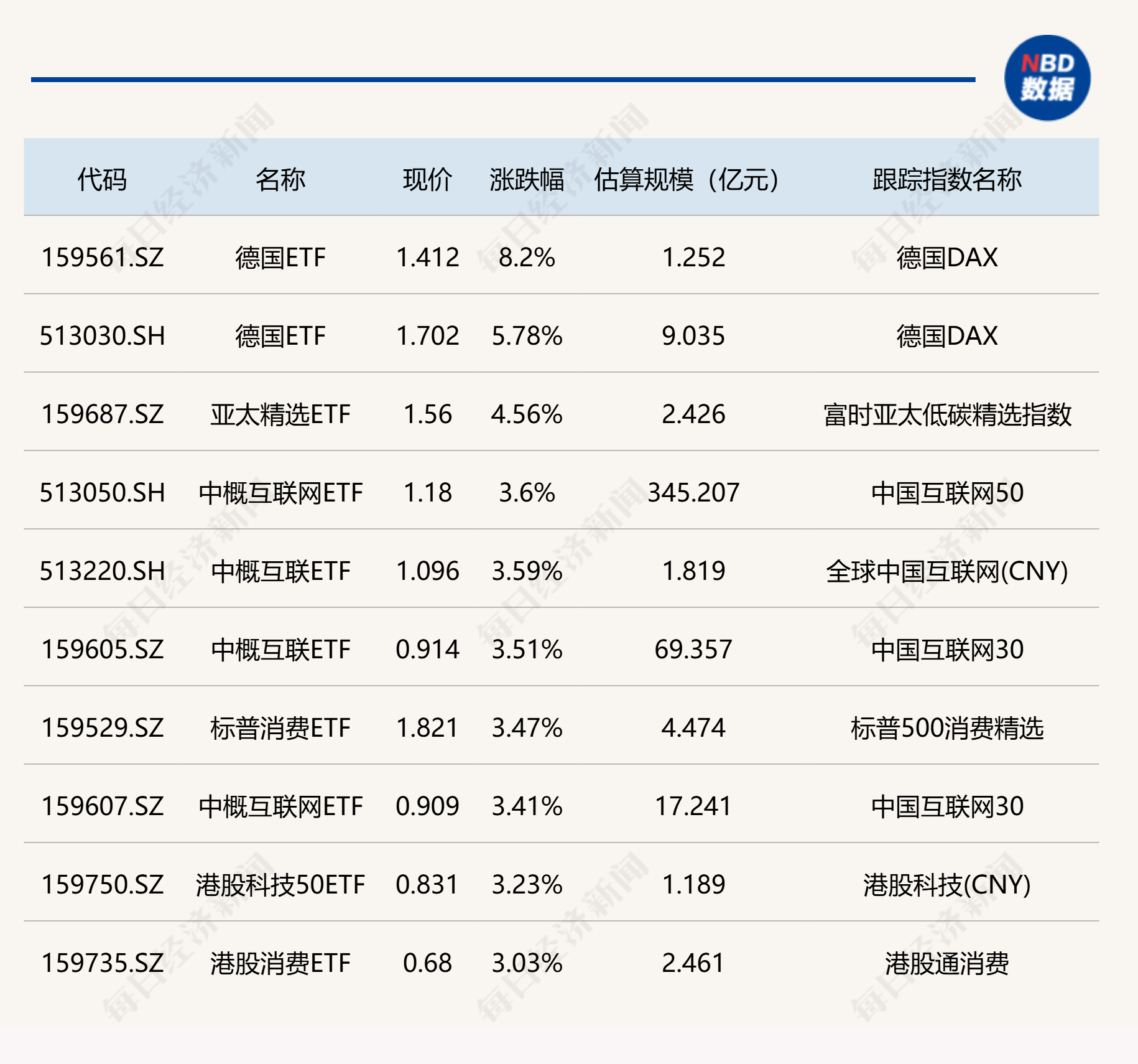 ETF涨跌幅方面,德国ETF涨逾8%,多只港股相关ETF涨逾3%。