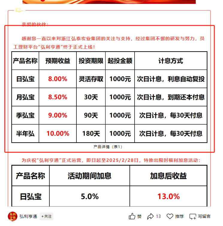 财联社记者注意到,近日,名为 “弘利亨通” 的微信公众号发布公告,浙江弘泰宏业集团推出员工理财平台“弘利亨通”。