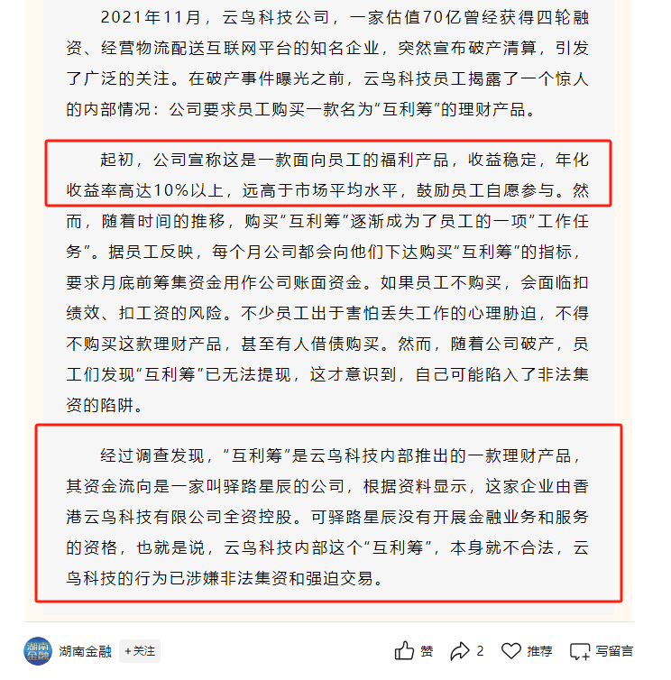 财联社记者注意到,湖南省地方金融管理局政务信息发布平台 “湖南金融” 1月18日发布案例,2021 年 11 月,估值 70 亿的知名物流配送平台企业云鸟科技突然宣布破产清算。而此前公司要求员工购买面向员工的福利产品“互利筹”理财也无法提现。文章显示,云鸟科技内部这个“互利筹”,本身就不合法,云鸟科技的行为已涉嫌非法集资和强迫交易。