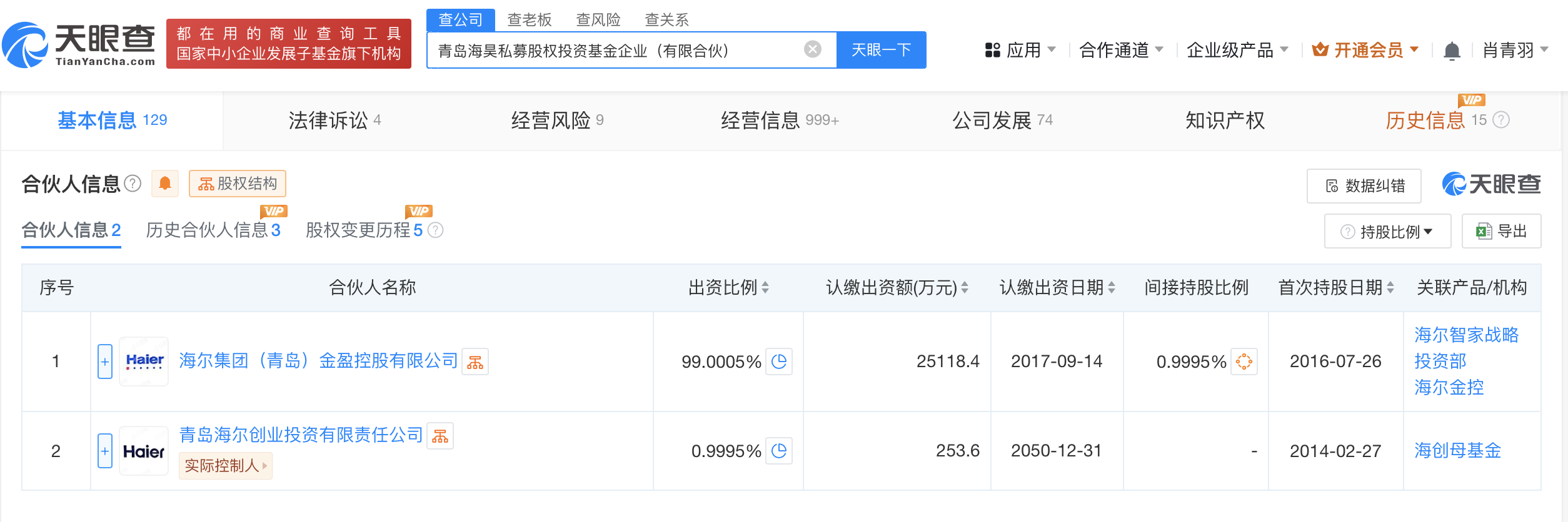 该基金成立于2014年2月,执行事务合伙人为青岛海尔创业投资有限责任公司,经营范围为股权投资、自有资金对外投资及投资管理。合伙人信息显示,该公司由海尔集团(青岛)金盈控股有限公司及旗下青岛海尔创业投资有限责任公司共同出资。