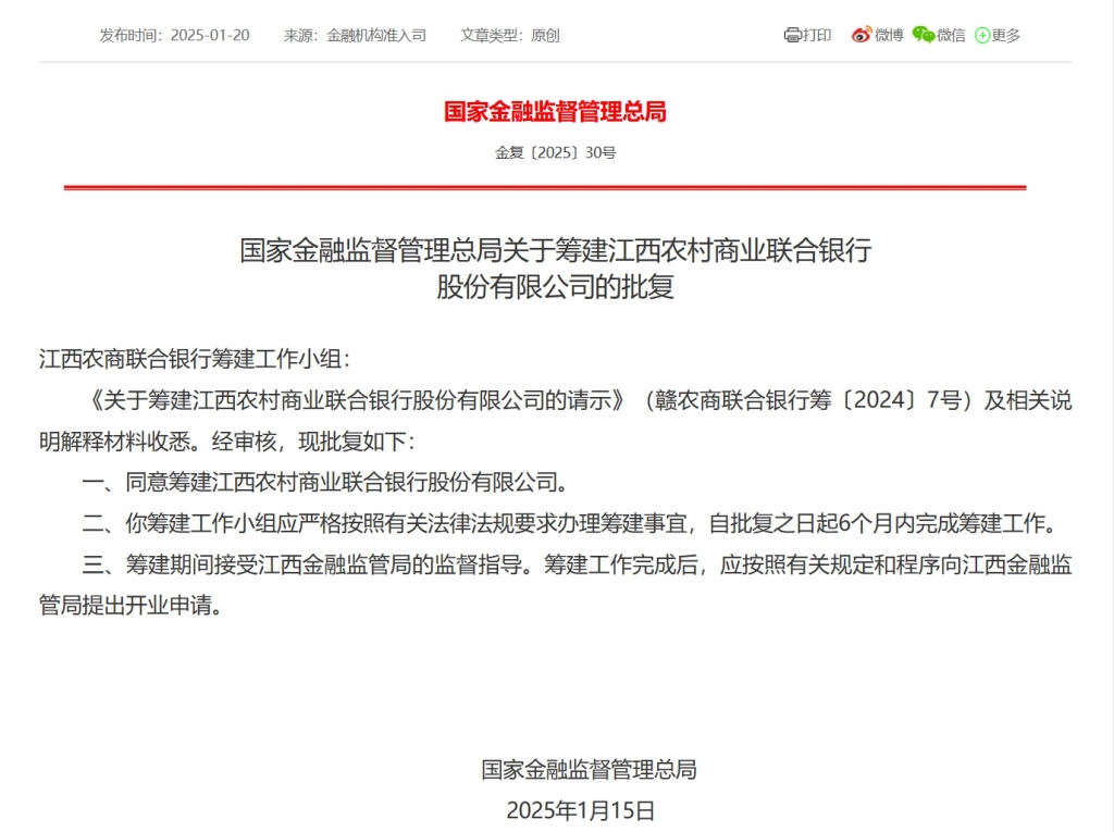 国家金融监督管理总局1月20日披露的批复显示,同意筹建江西农商联合银行。筹建工作小组应严格按照有关法律法规要求办理筹建事宜,自批复之日起6个月内完成筹建工作。批复的落款时间为2025年1月15日。