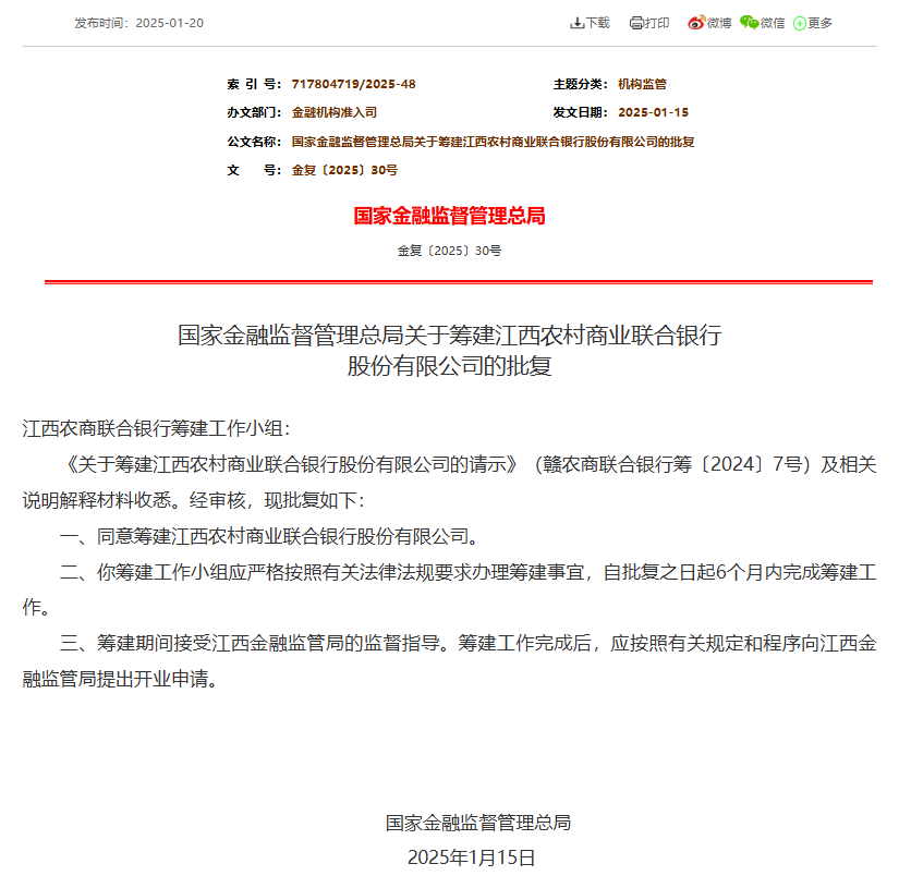 上证报中国证券网讯(记者黄坤)1月20日,国家金融监督管理总局官网显示,江西农村商业联合银行股份有限公司日前获批筹建。