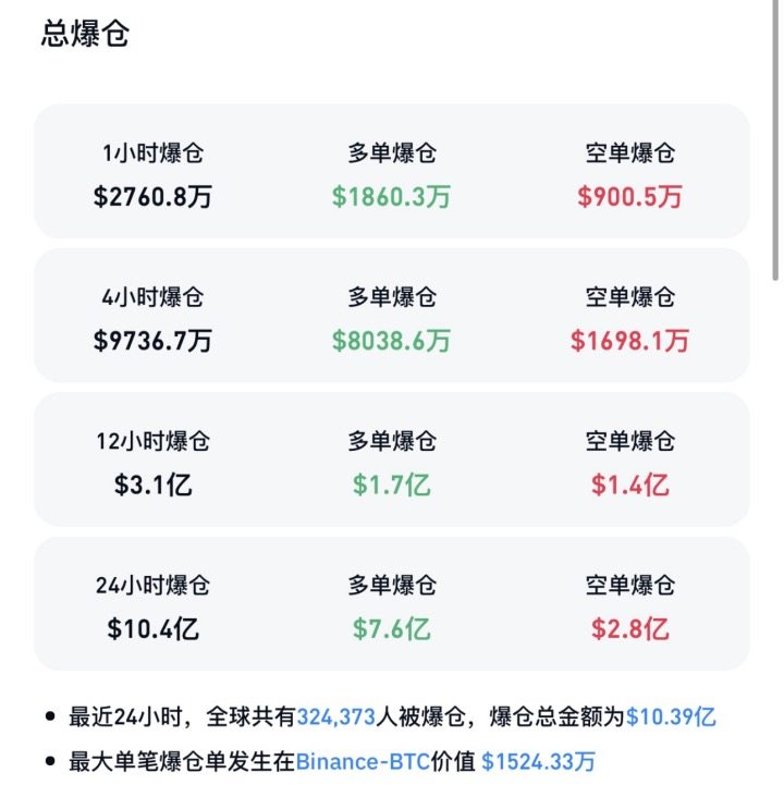 CoinGlass数据显示,最近24小时内,超32.44万人爆仓,爆仓总金额达10.4亿美元。其中,多单爆仓金额达到7.6亿美元,空单爆仓金额达到2.8亿美元。最大单笔爆仓单发生在Binance-BTC,价值为1524.33万美元。