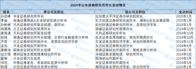 再早前,兴业证券研究所副所长孟杰8月加盟东方财富证券,任研究所所长一职;7月,国泰君安研究所所长助理廖静池跳槽至浙商证券,任研究所副所长、策略首席分析师;3月,德邦证券总裁助理兼研究所所长任志强、兴业证券汽车首席戴畅、中泰证券家电、美妆团队首席分析师邓欣纷纷出走,分别任华福证券总裁助理、研究所所长、国海研究所副所长以及华安证券研究所副所长;1月,中信证券宏观经济首席分析师程强加入德邦证券,现任首席经济学家、研究所所长。