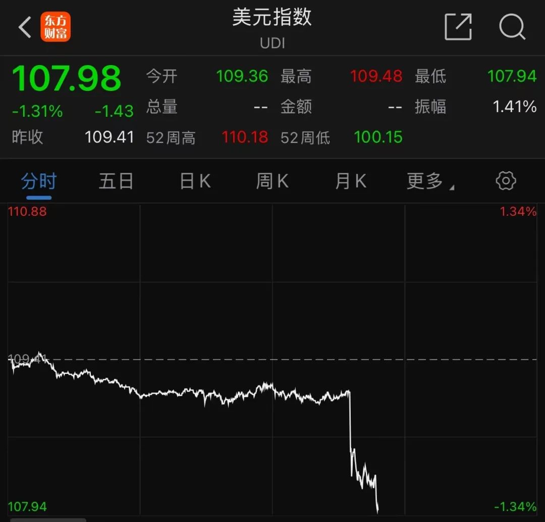 今晚人民币直线拉升的直接原因是美元指数走低。美元指数一度下探至108下方,日内跌超1.3%。