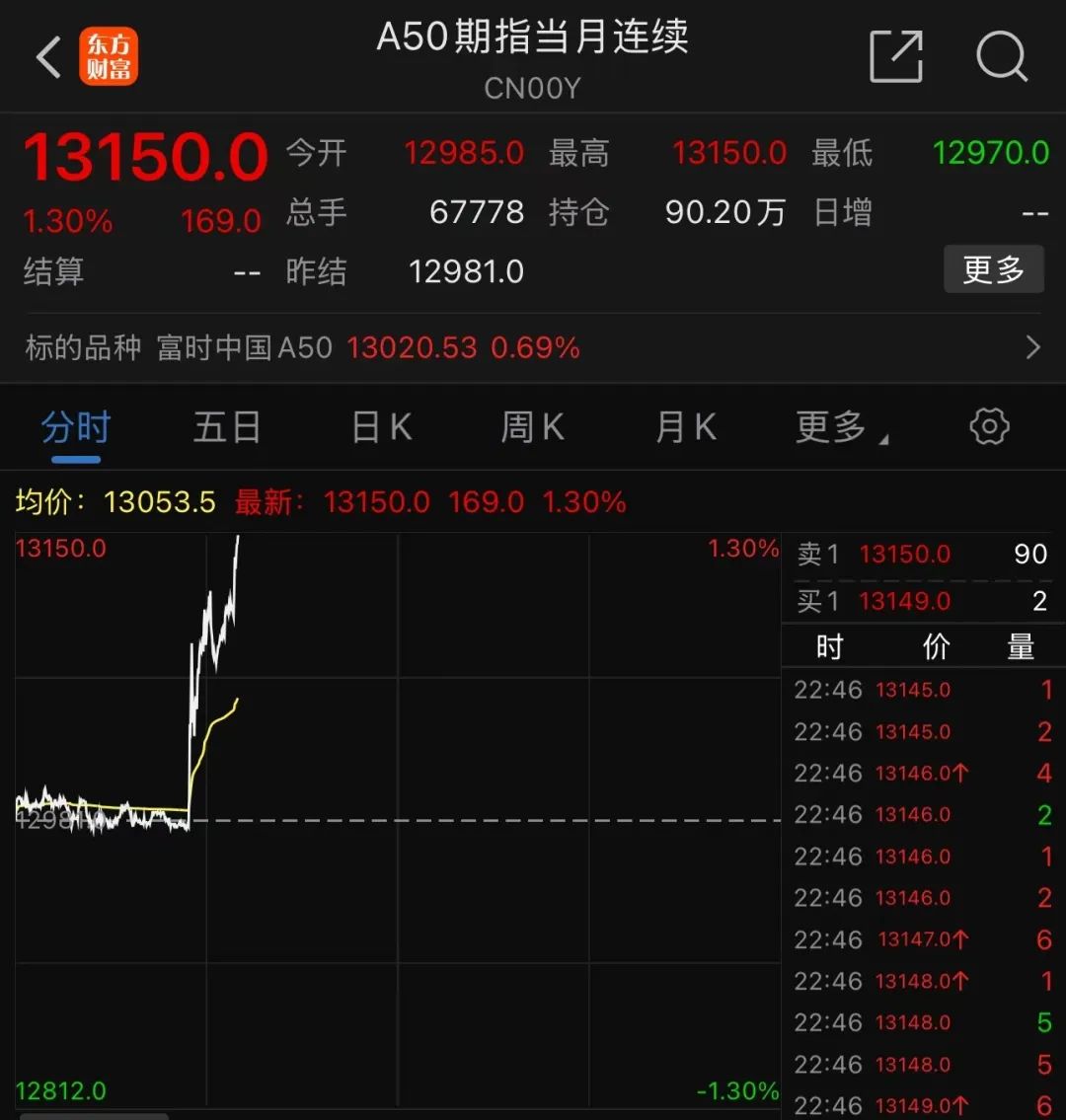 周一晚间,A50指数直线拉升。截至发稿,A50期指当月连续涨破13000点,涨超1.3%。