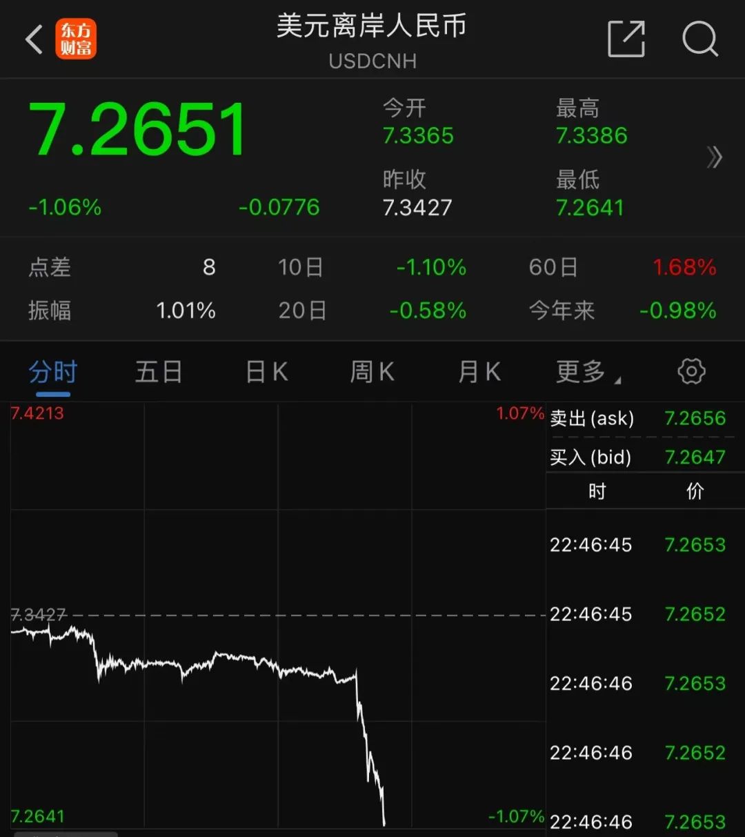 1月20日晚间,离岸人民币兑美元持续走高,日内一度涨超770个基点,盘中收复7.27关口。