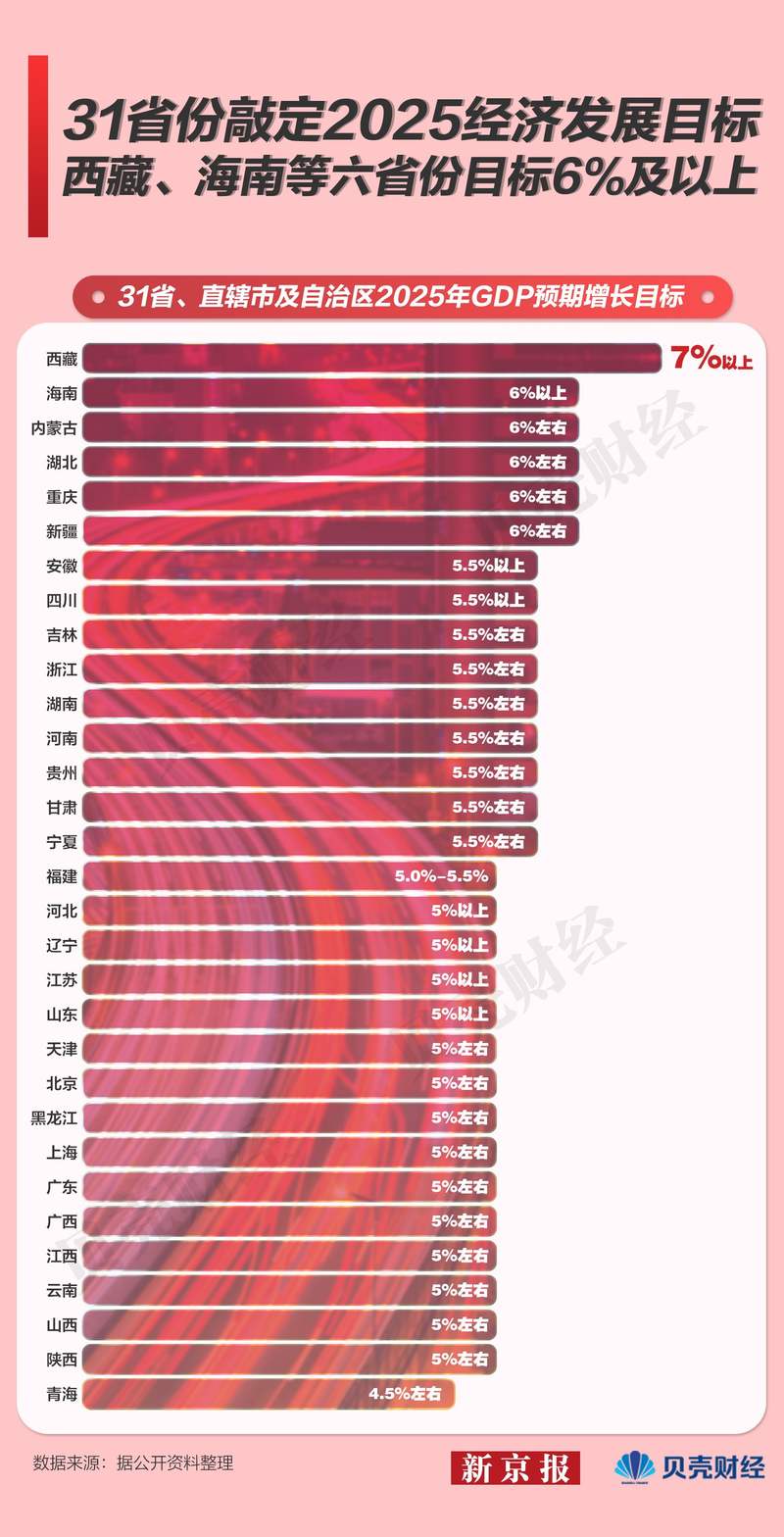 截至1月20日,全国31省份已全部召开两会,公布了2025年经济增长目标。新京报贝壳财经记者梳理发现,西藏2025年经济增长目标最高,提出地区生产总值增长7%以上、力争8%。此外,海南提出GDP增长6%以上;内蒙古、湖北、重庆、新疆提出GDP增长6%左右。超半数省份锚定GDP增长5%-5.5%,10省份将目标定为GDP增长5%左右。六经济大省中,四川GDP增长目标定在5.5%以上;浙江、河南则为5.5%左右;江苏、山东为5%以上;广东则为5%左右。