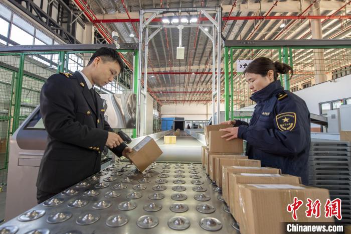 1月10日,在江西新余国际陆港,海关工作人员为跨境电商产品办理通关业务。赵春亮摄