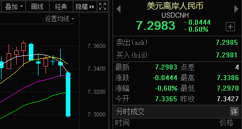 【大河财立方消息】1月20日晚间,离岸人民币兑美元快速拉升,收复7.30关口,现报7.2968,日内涨超400点。