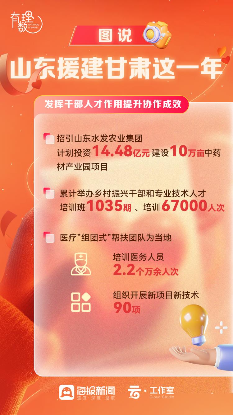 推动社会民生事业实现新发展,医疗“组团式”帮扶团队为当地培训医务人员2.2万余人次,组织开展新项目新技术90项,34名干部人才获得表彰奖励、提拔重用,18人被评为山东省“组团式”帮扶甘肃先进教育工作者,43人被评为山东省“组团式”帮扶甘肃优秀教师。