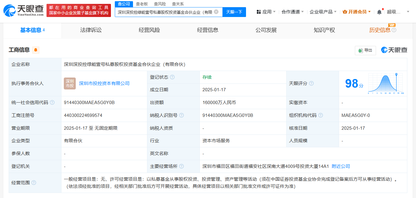 南方财经1月20日电,天眼查App显示,近日,深圳深投控绿能壹号私募股权投资基金合伙企业(有限合伙)成立,执行事务合伙人为深圳市投控资本有限公司,出资额16亿人民币,经营范围包括以私募基金从事股权投资、投资管理、资产管理等活动。合伙人信息显示,该基金由海港人寿保险股份有限公司、深圳市投控资本有限公司共同出资。