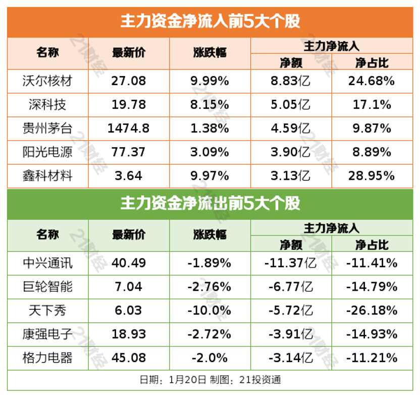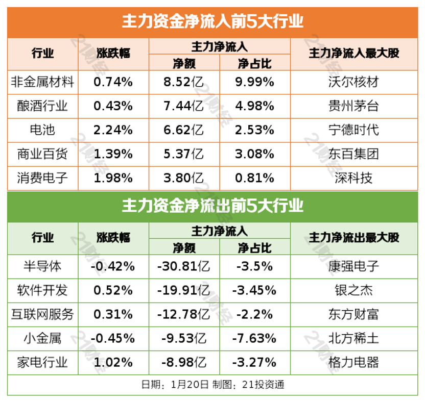1月20日,市场全天冲高回落,创业板指领涨。沪深两市全天成交额1.18万亿,较上个交易日放量474亿。截至收盘,沪指涨0.08%,深成指涨0.94%,创业板指涨1.81%。 盘面上,热点快速轮动,个股涨多跌少,全市场超3600只个股上涨。