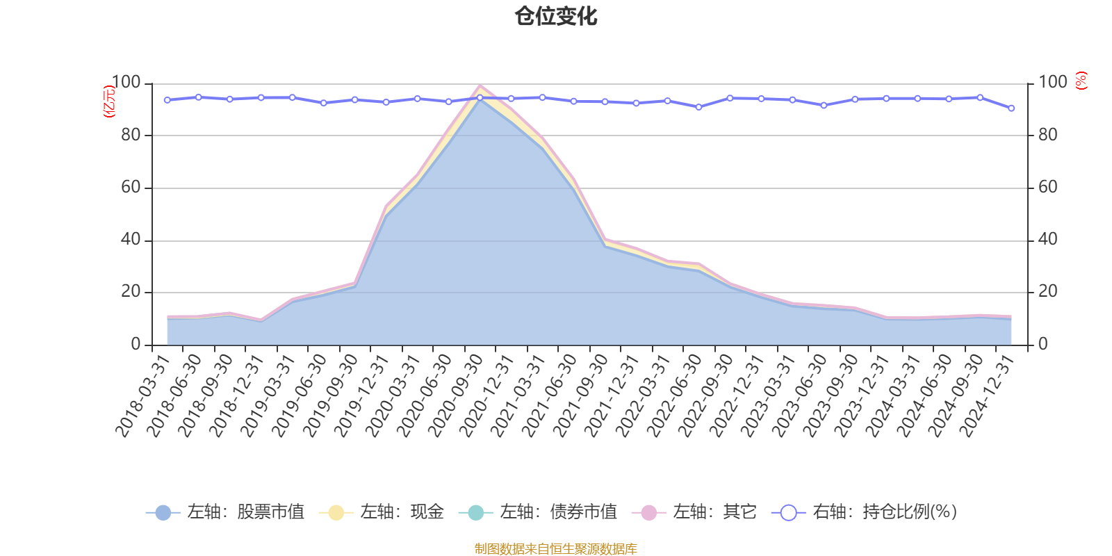 据定期报告数据统计,基金股票仓位长期保持较高水平,近三年平均股票仓位为93.31%,同类平均为79.91%。2018年上半年末基金达到94.73%的最高仓位,2024年末最低,为90.53%。