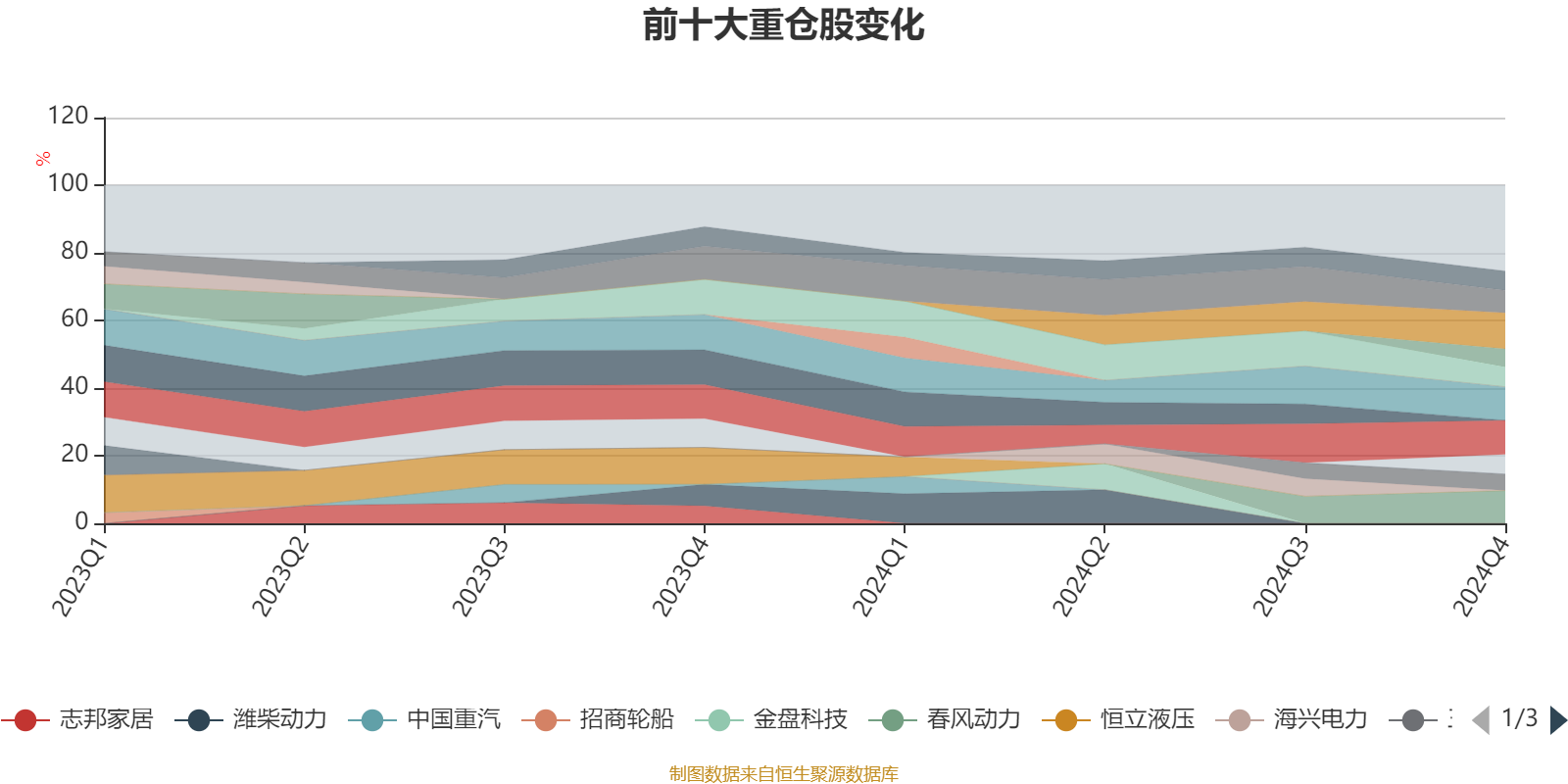 该基金持股集中度较高,近2年前十大重仓股集中度长期超过60%。截至2024年四季度末,基金十大重仓股分别是宇通客车、滨江集团、招商蛇口、春风动力、安徽合力、杭叉集团、三棵树、徐工机械、保利发展、三一重工。