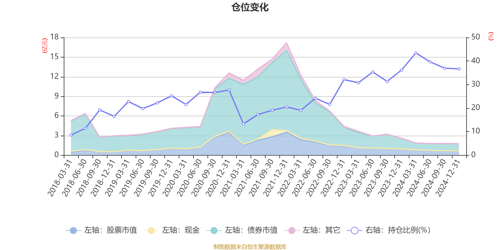 据定期报告数据统计,近三年平均股票仓位为32.27%,同类平均为18.57%。2024年一季度末基金达到43.42%的最高仓位,2018年一季度末最低,为8.56%。