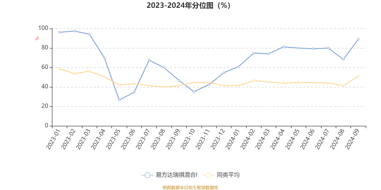 通过所选区间该基金净值增长率分位图,可以观察该基金与同类基金业绩比较情况。图为坐标原点到区间内某时点的净值增长率在同类基金中的分位数。