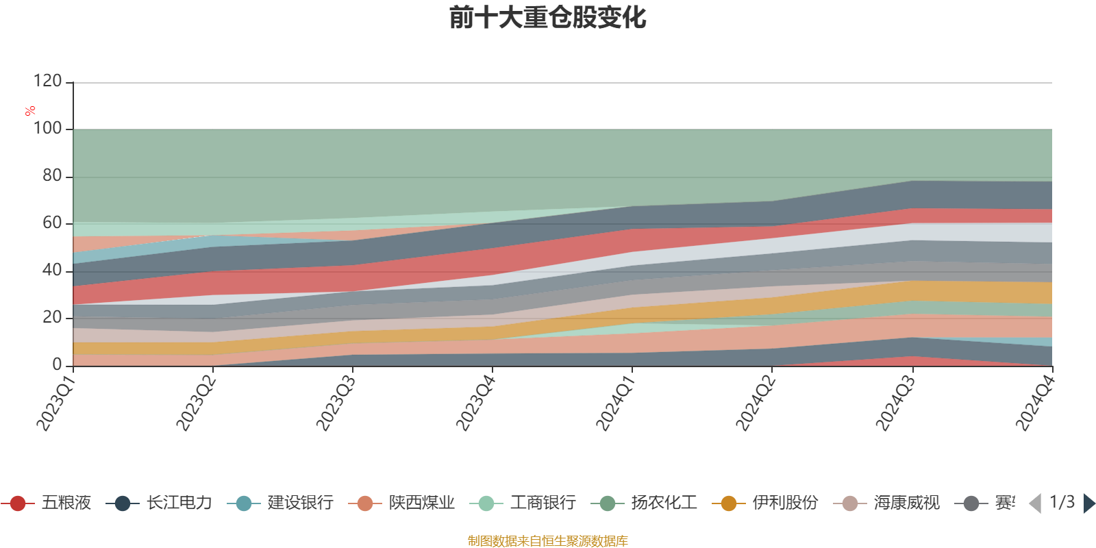 该基金持股集中度较高,近2年前十大重仓股集中度长期超过60%。截至2024年四季度末,基金十大重仓股分别是京沪高铁、伊利股份、美的集团、陕西煤业、招商公路、长江电力、赛轮轮胎、贵州茅台、扬农化工、建设银行。