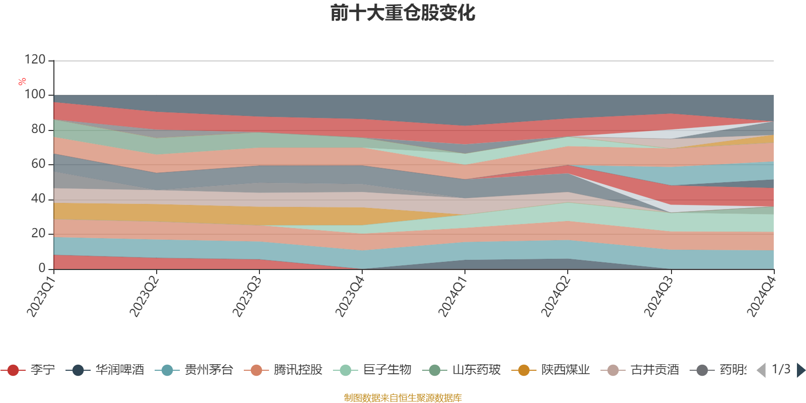 该基金持股集中度较高,近2年前十大重仓股集中度长期超过60%。截至2024年四季度末,基金十大重仓股分别是中国海洋石油、贵州茅台、腾讯控股、分众传媒、阿里巴巴-W、巨子生物、山西汾酒、宝丰能源、山东药玻、京东健康。