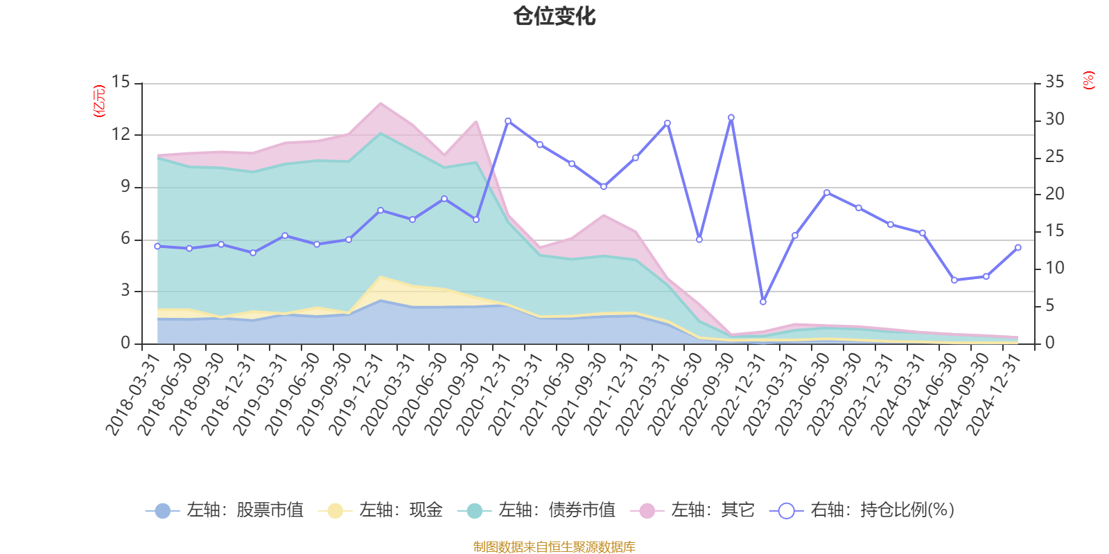 据定期报告数据统计,近三年平均股票仓位为16.18%,同类平均为18.57%。2022年三季度末基金达到30.39%的最高仓位,2022年末最低,为5.64%。