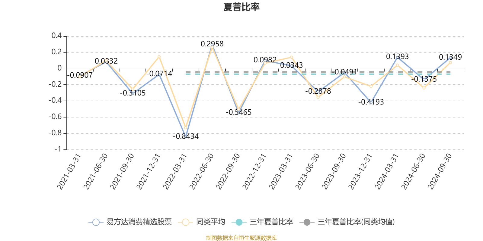 截至9月30日,基金近三年夏普比率为-0.0681,位于同类可比基金21/42。