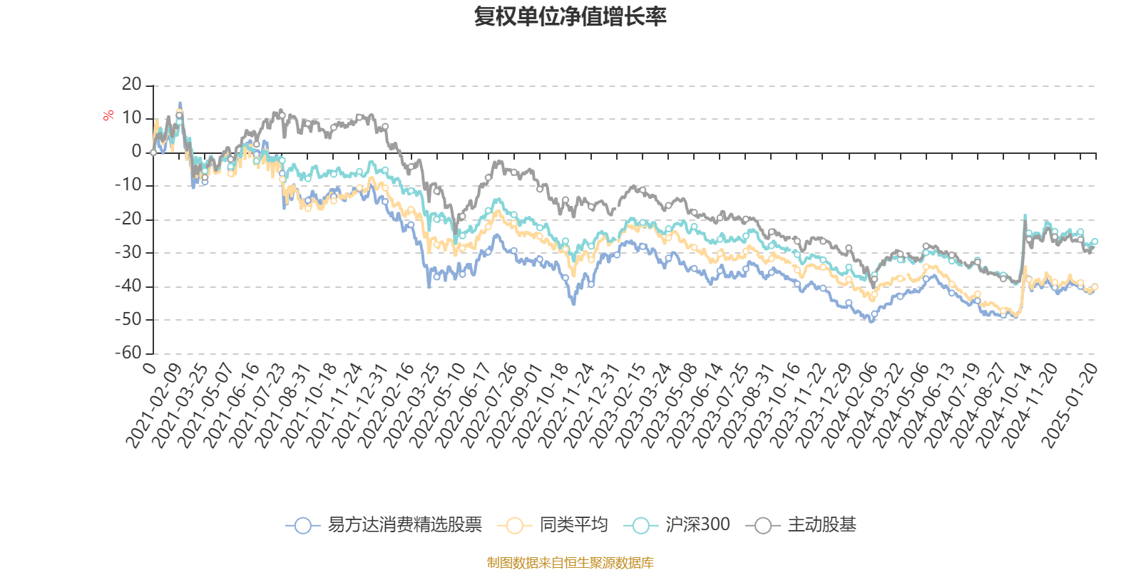 截至1月20日,易方达消费精选股票近三个月复权单位净值增长率为-0.82%,位于同类可比基金21/46;近半年复权单位净值增长率为7.48%,位于同类可比基金13/46;近一年复权单位净值增长率为16.09%,位于同类可比基金6/46;近三年复权单位净值增长率为-26.37%,位于同类可比基金17/42。