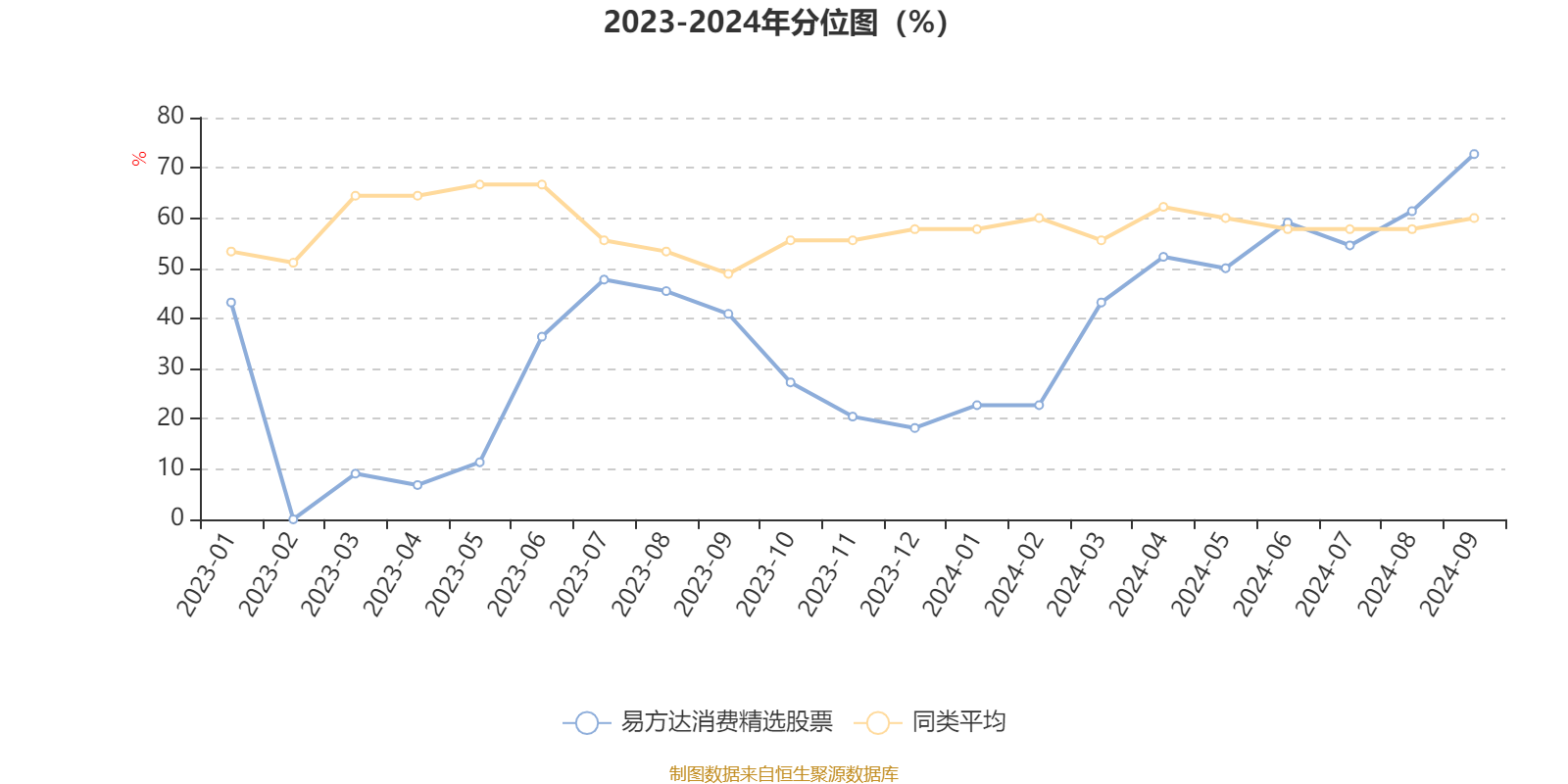 通过所选区间该基金净值增长率分位图,可以观察该基金与同类基金业绩比较情况。图为坐标原点到区间内某时点的净值增长率在同类基金中的分位数。