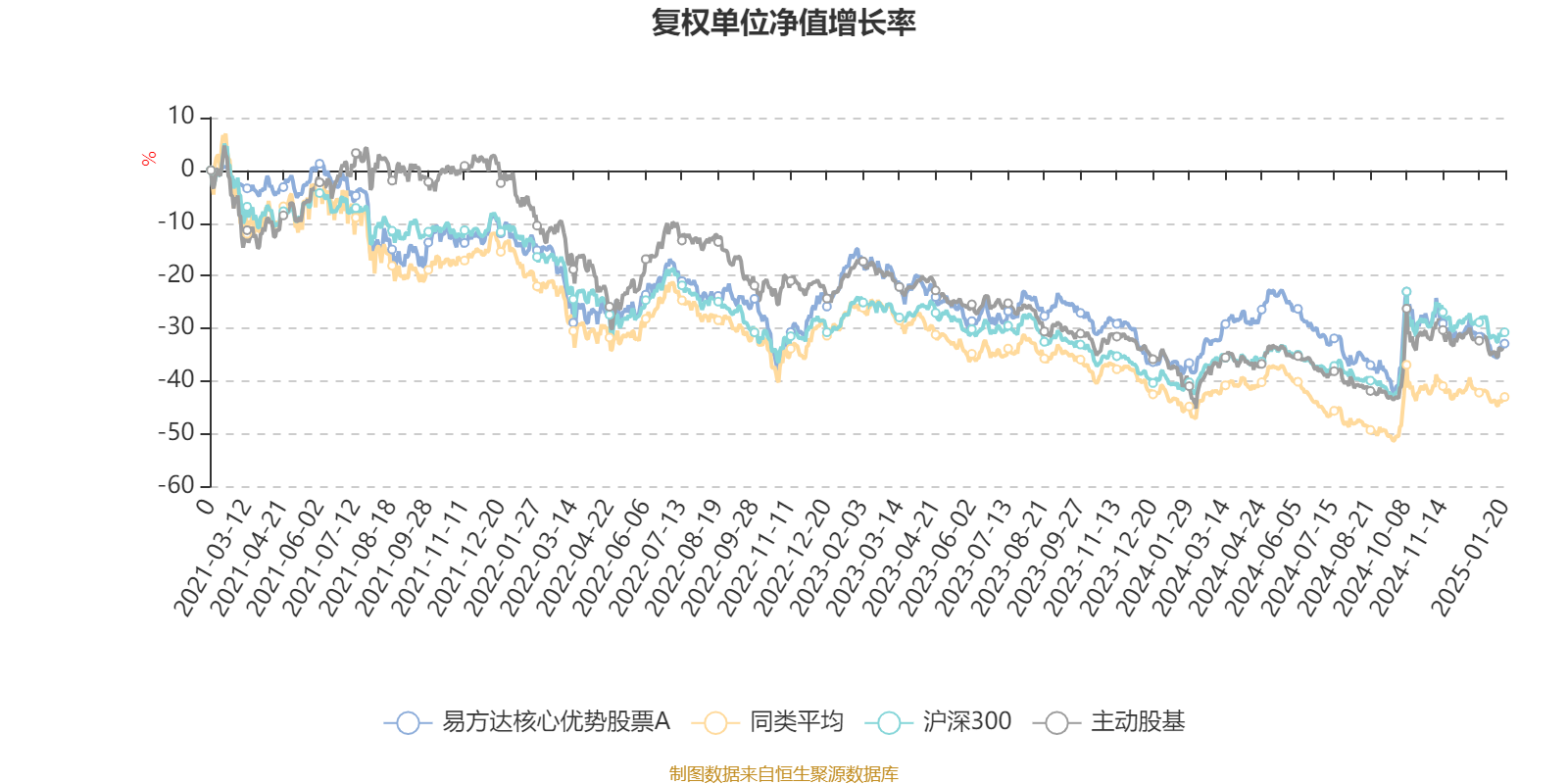 截至1月20日,易方达核心优势股票A近三个月复权单位净值增长率为-5.66%,位于同类可比基金43/46;近半年复权单位净值增长率为-2.04%,位于同类可比基金37/46;近一年复权单位净值增长率为7.22%,位于同类可比基金15/46;近三年复权单位净值增长率为-22.91%,位于同类可比基金16/42。