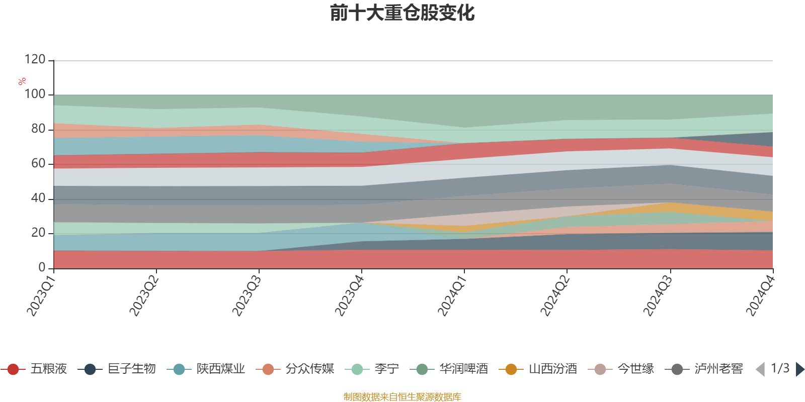 该基金持股集中度较高,近2年前十大重仓股集中度长期超过60%。截至2024年四季度末,基金十大重仓股分别是中国海洋石油、贵州茅台、腾讯控股、巨子生物、五粮液、泸州老窖、阿里巴巴-W、分众传媒、古井贡酒、山西汾酒。
