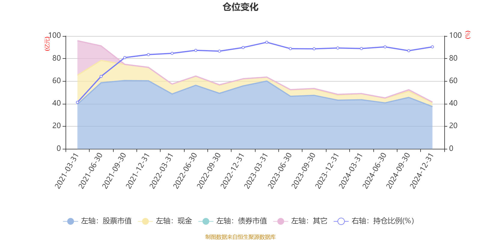 据定期报告数据统计,近三年平均股票仓位为88.85%,同类平均为87.17%。2023年一季度末基金达到94.46%的最高仓位,2021年一季度末最低,为41.27%。