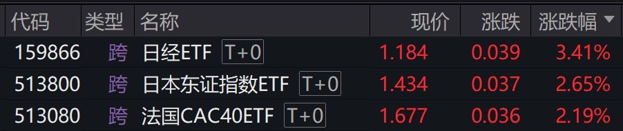 部分跨境ETF早盘再度拉升,日经ETF涨逾3%,日本东证指数ETF、法国CAC40ETF涨逾2%