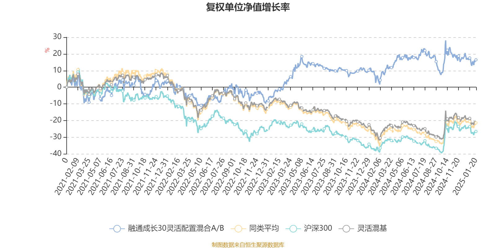 截至1月20日,融通成长30灵活配置混合A/B近三个月复权单位净值增长率为-5.26%,位于同类可比基金823/920;近半年复权单位净值增长率为-4.53%,位于同类可比基金882/920;近一年复权单位净值增长率为9.08%,位于同类可比基金516/920;近三年复权单位净值增长率为15.45%,位于同类可比基金17/898。