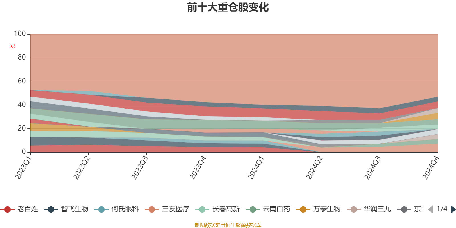 截至2024年四季度末,基金十大重仓股分别是三友医疗、一心堂、华海药业、健之佳、华润三九、美好医疗、药明康德、开立医疗、云南白药、鱼跃医疗。