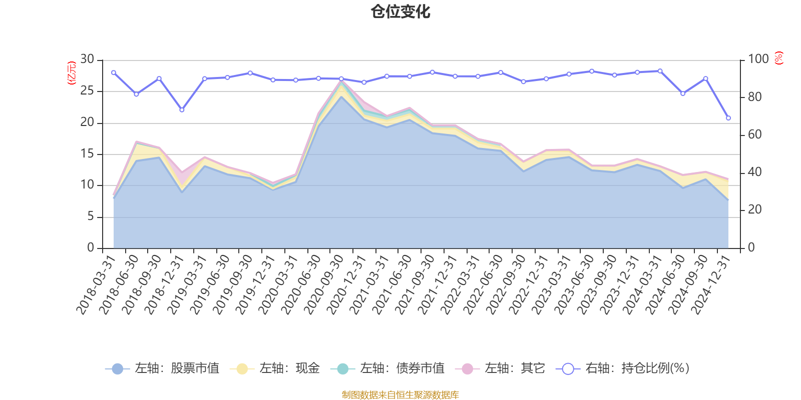 据定期报告数据统计,近三年平均股票仓位为89.25%,同类平均为86.48%。2024年一季度末基金达到94.16%的最高仓位,2024年末最低,为69.19%。