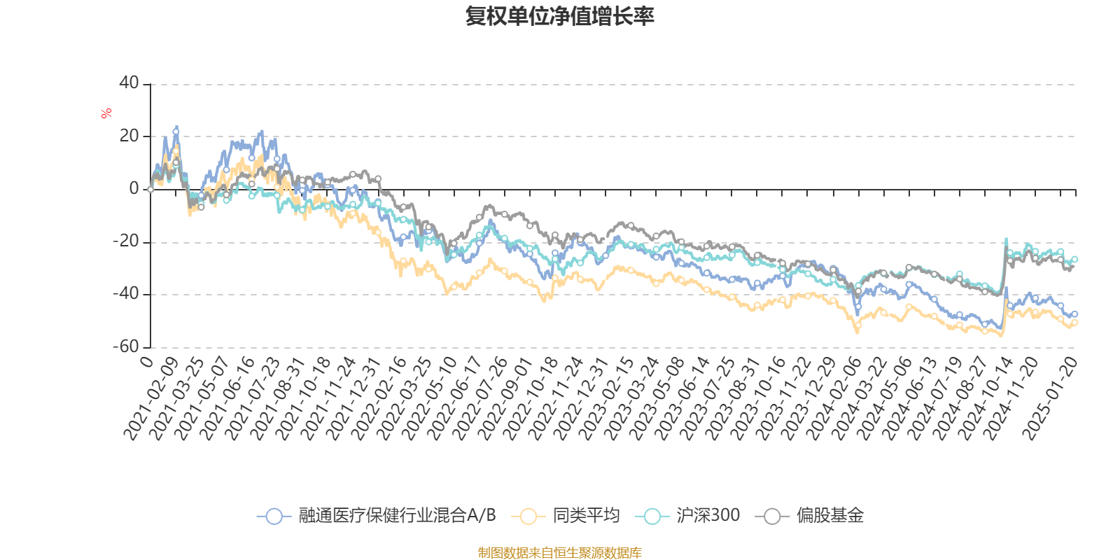 截至1月20日,融通医疗保健行业混合A/B近三个月复权单位净值增长率为-5.22%,位于同类可比基金35/129;近半年复权单位净值增长率为0.41%,位于同类可比基金70/129;近一年复权单位净值增长率为-18.11%,位于同类可比基金122/127;近三年复权单位净值增长率为-38.70%,位于同类可比基金67/98。