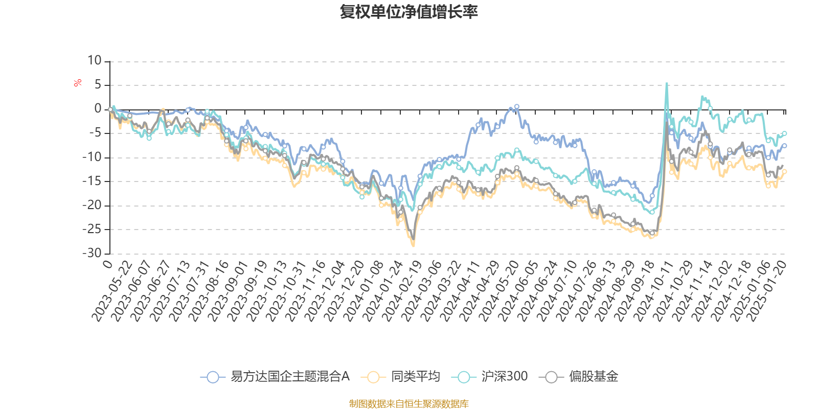 截至1月20日,易方达国企主题混合A近三个月复权单位净值增长率为-2.29%,位于同类可比基金103/210;近半年复权单位净值增长率为2.25%,位于同类可比基金168/210;近一年复权单位净值增长率为11.06%,位于同类可比基金124/210。
