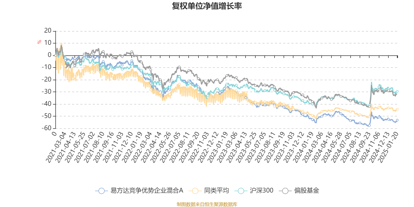 截至1月20日,易方达竞争优势企业混合A近三个月复权单位净值增长率为-4.88%,位于同类可比基金14/17;近半年复权单位净值增长率为-0.36%,位于同类可比基金12/17;近一年复权单位净值增长率为-1.12%,位于同类可比基金15/16;近三年复权单位净值增长率为-46.55%,位于同类可比基金14/15。