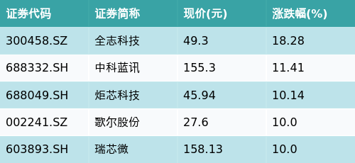 截至午间收盘,智能音箱主题涨跌幅最高的五只股票为:全志科技(300458.SZ)、中科蓝讯(688332.SH)、炬芯科技(688049.SH)、歌尔股份(002241.SZ)与瑞芯微(603893.SH)。详情见下表: