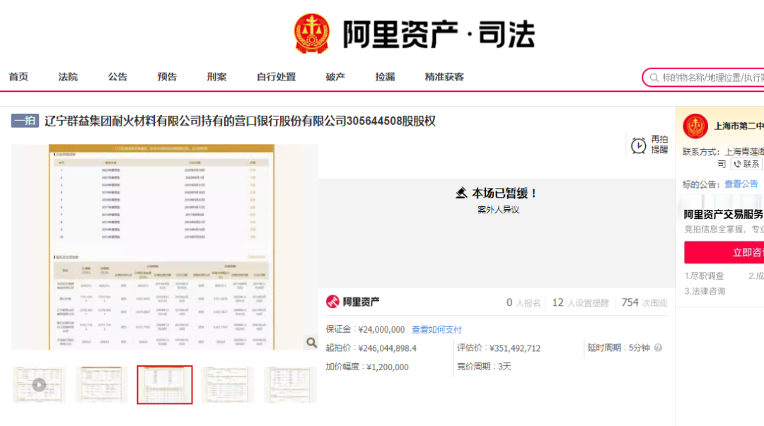 近日,一则银行股权拍卖信息引起市场关注。阿里资产拍卖平台显示,营口银行原定于1月24日公开拍卖的3.06亿股股权由“即将开始”变更为“已暂缓”,主要原因为案外人异议。